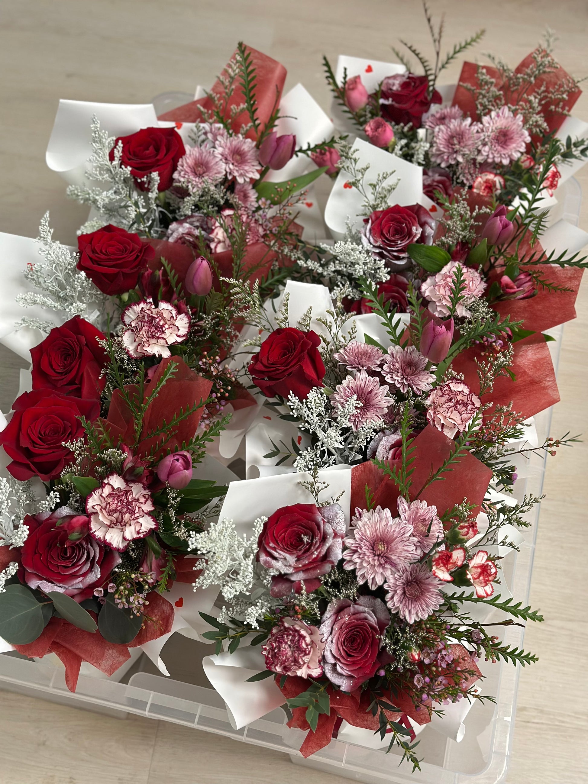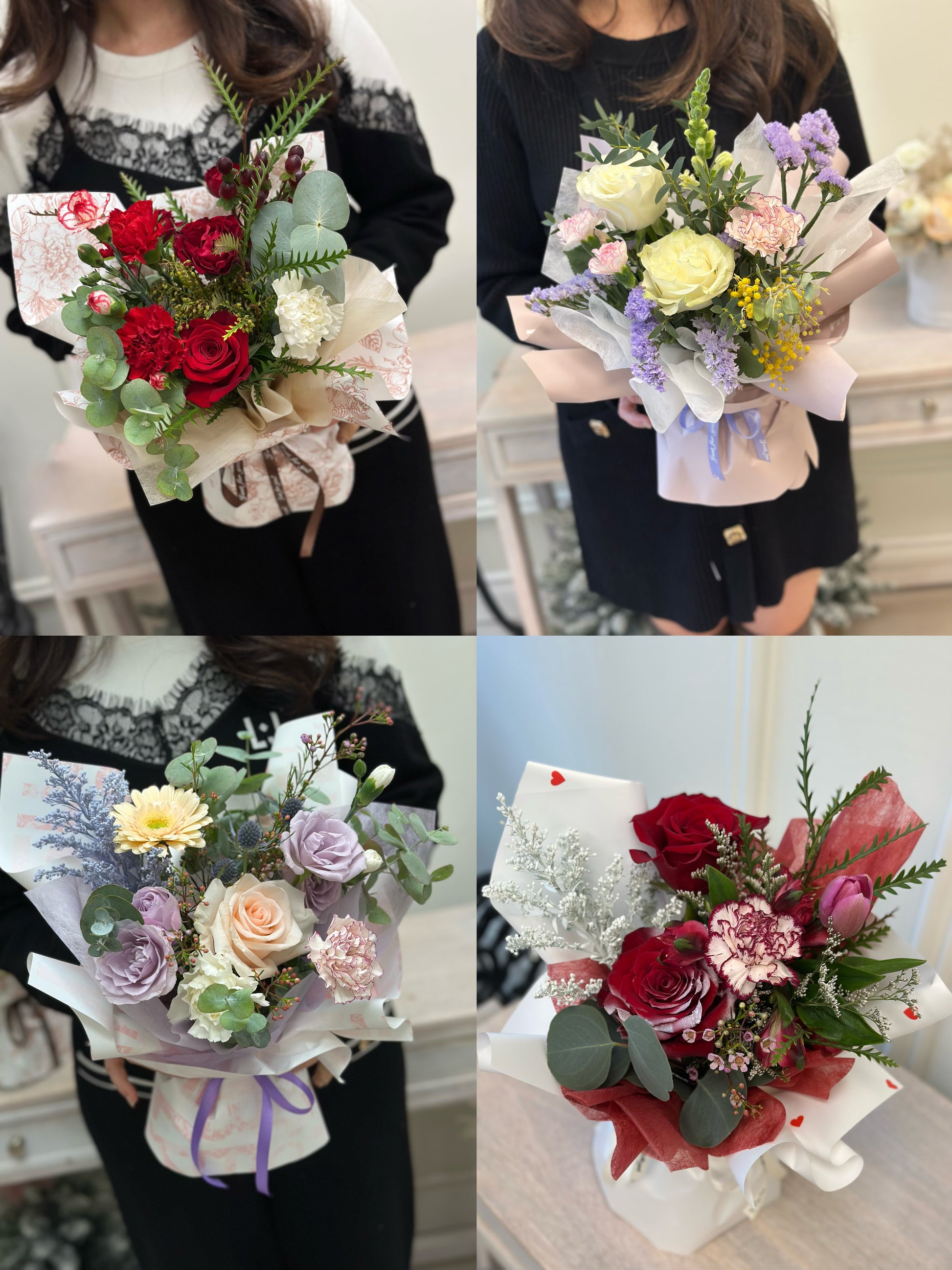 Each bouquet is made with fresh, seasonal flowers in holiday-inspired tones — think cozy winter whites, merry reds, or sparkling metallics. No two are ever the same, keeping the surprise and wonder alive.