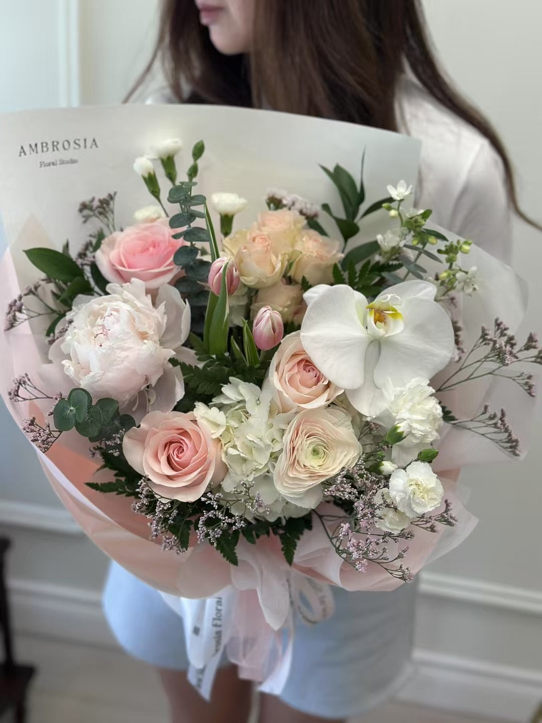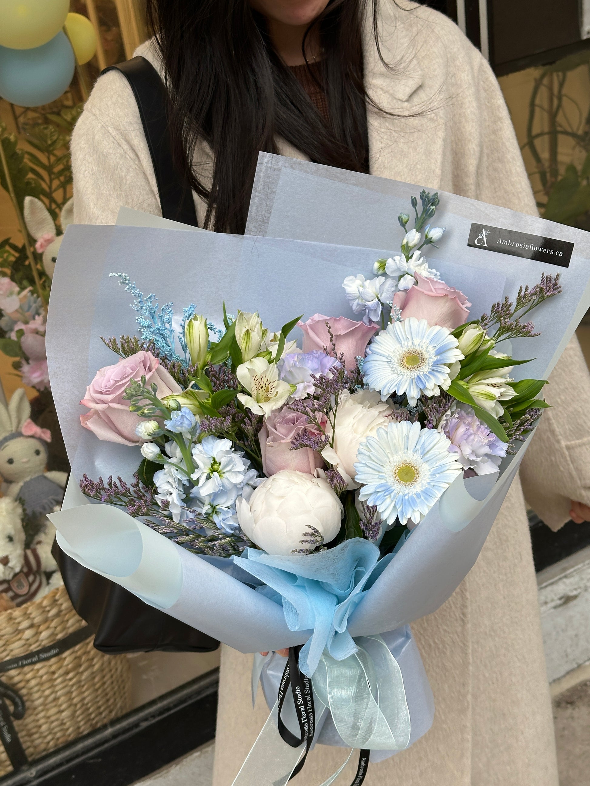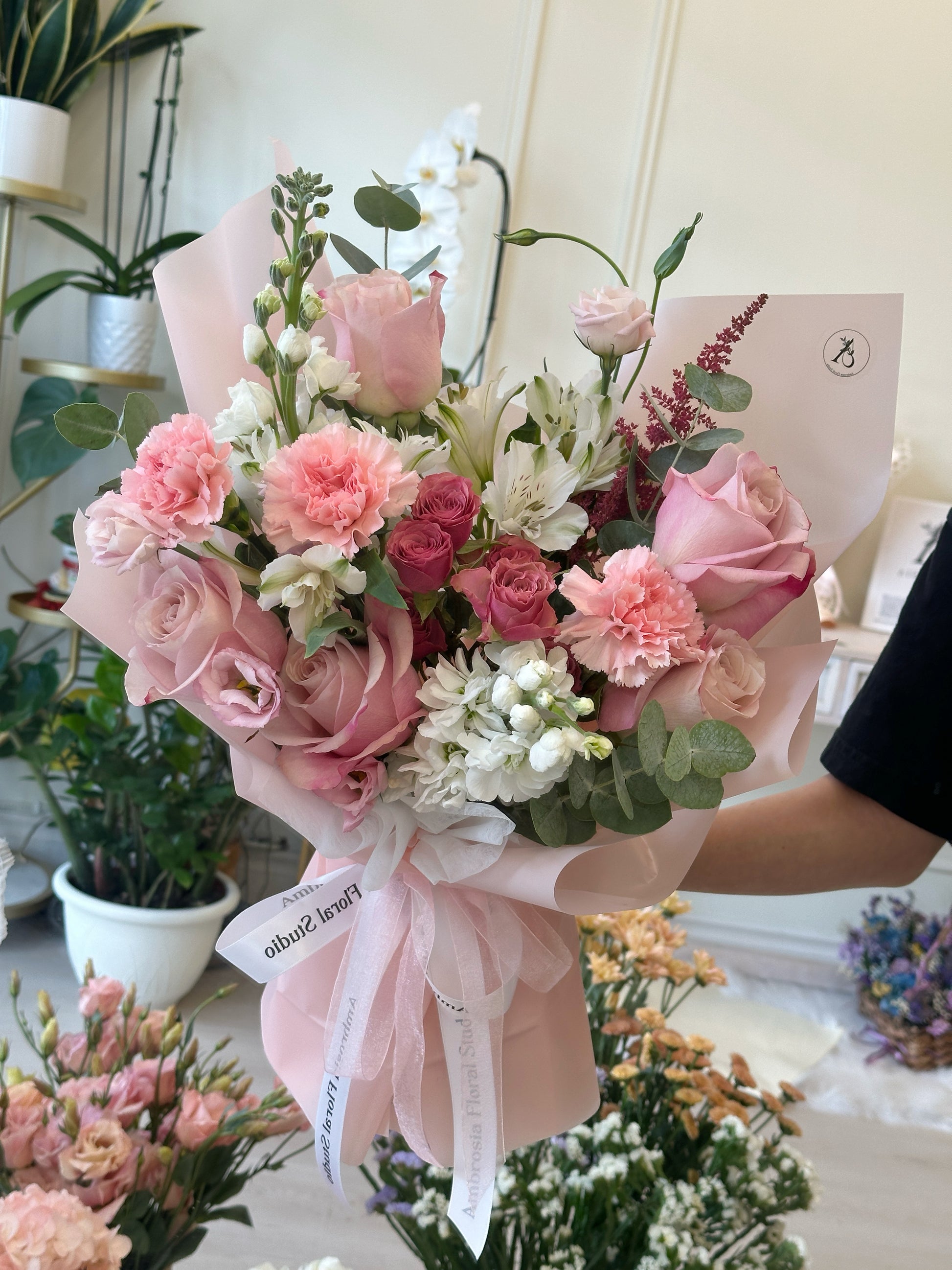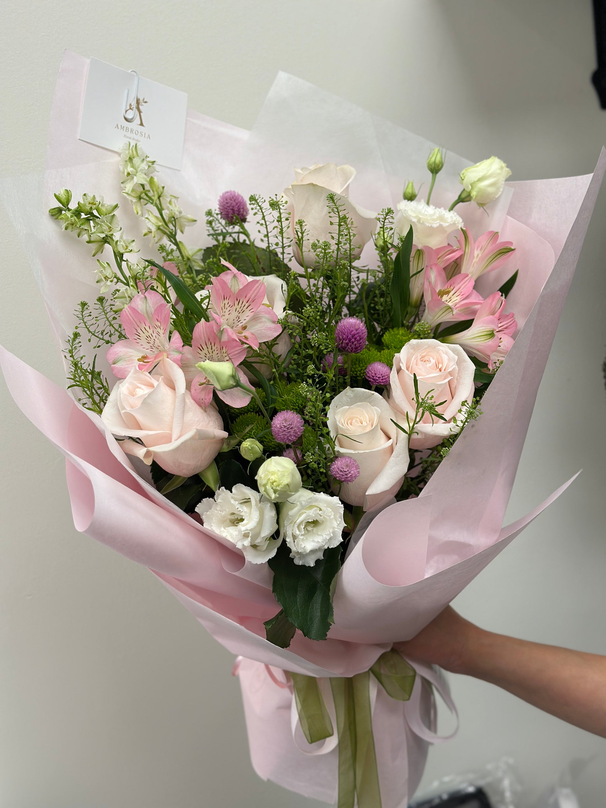 A delightful assortment of hand-selected blooms curated by our expert florists. Perfect for any occasion, our Florist's Pick Mixed Bouquet is sure to brighten someone's day and add a touch of natural elegance to any space. Let our florists' expertise create a stunning arrangement that will leave a lasting impression.