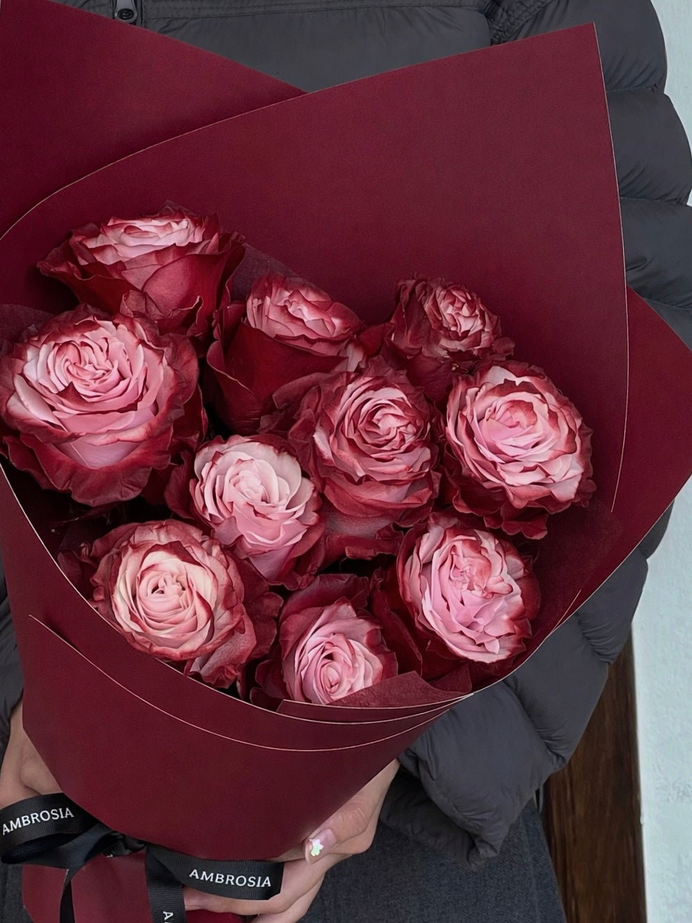 10 Stems of premiun Ecuadorian Mauve Rose in Red Wrapping