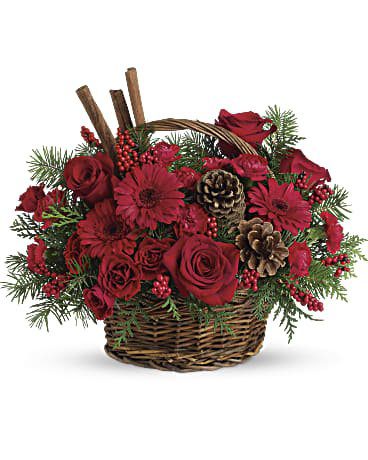 - A handled basket of red flowers including roses, red gerbera daisies and carnations is topped with festive cinnamon sticks.