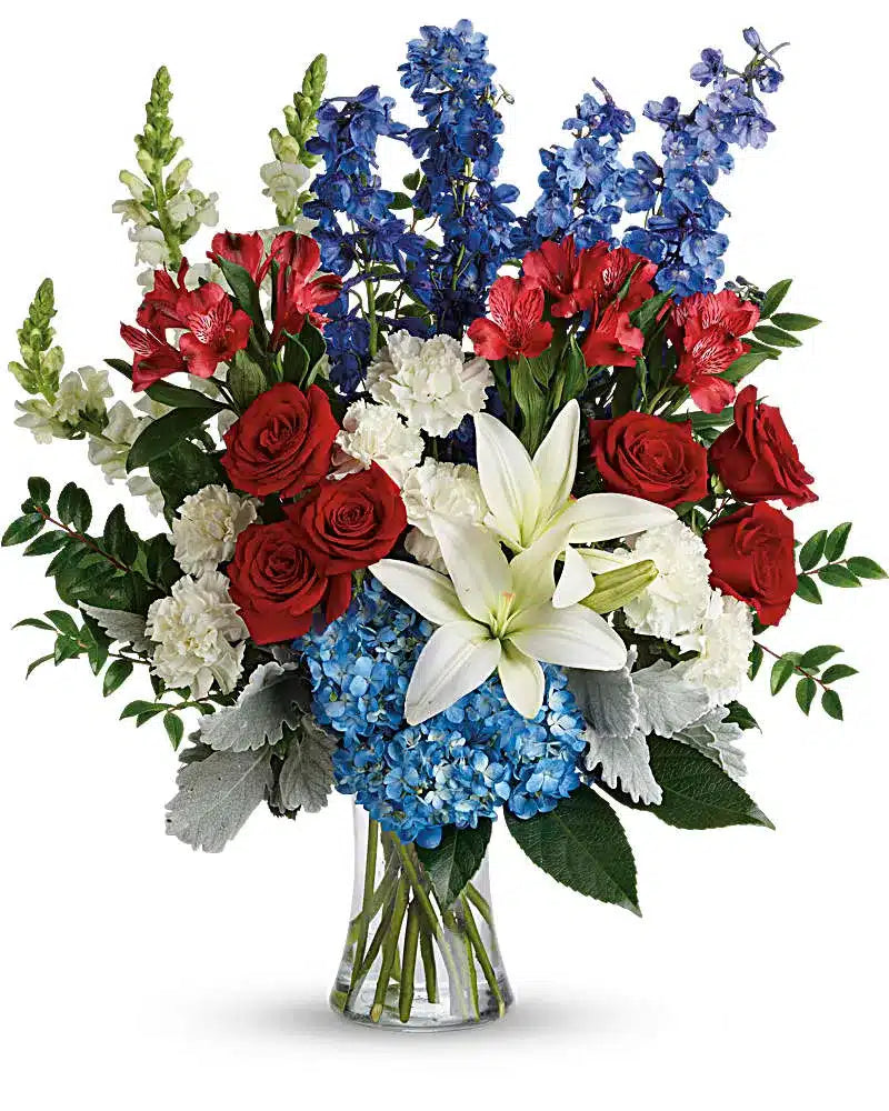 Perfectly patriotic with its red, white and blue blooms, this bold bouquet of hydrangea, lilies and roses is a versatile tribute on any occasion.