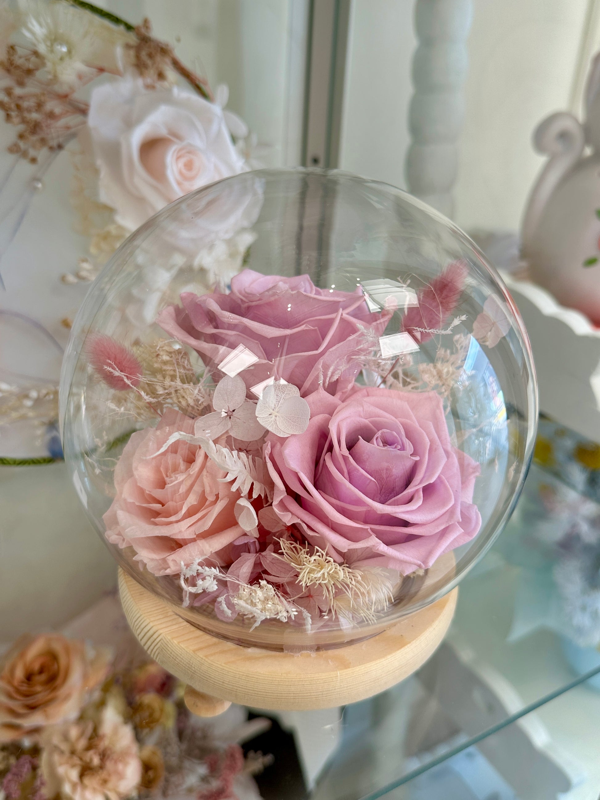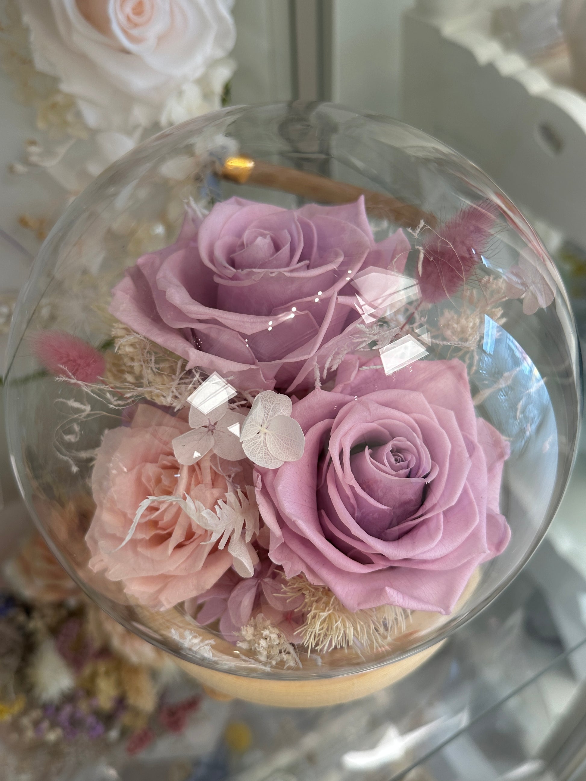 Preserved purple and pink rose surronded by the ethereal beauty of hydrangeas and other dried flowers, delicately encased in a glass dome with fairy lights. This enchanting arrangement brings a touch of magic to any space, capturing the essence of everlasting elegance.