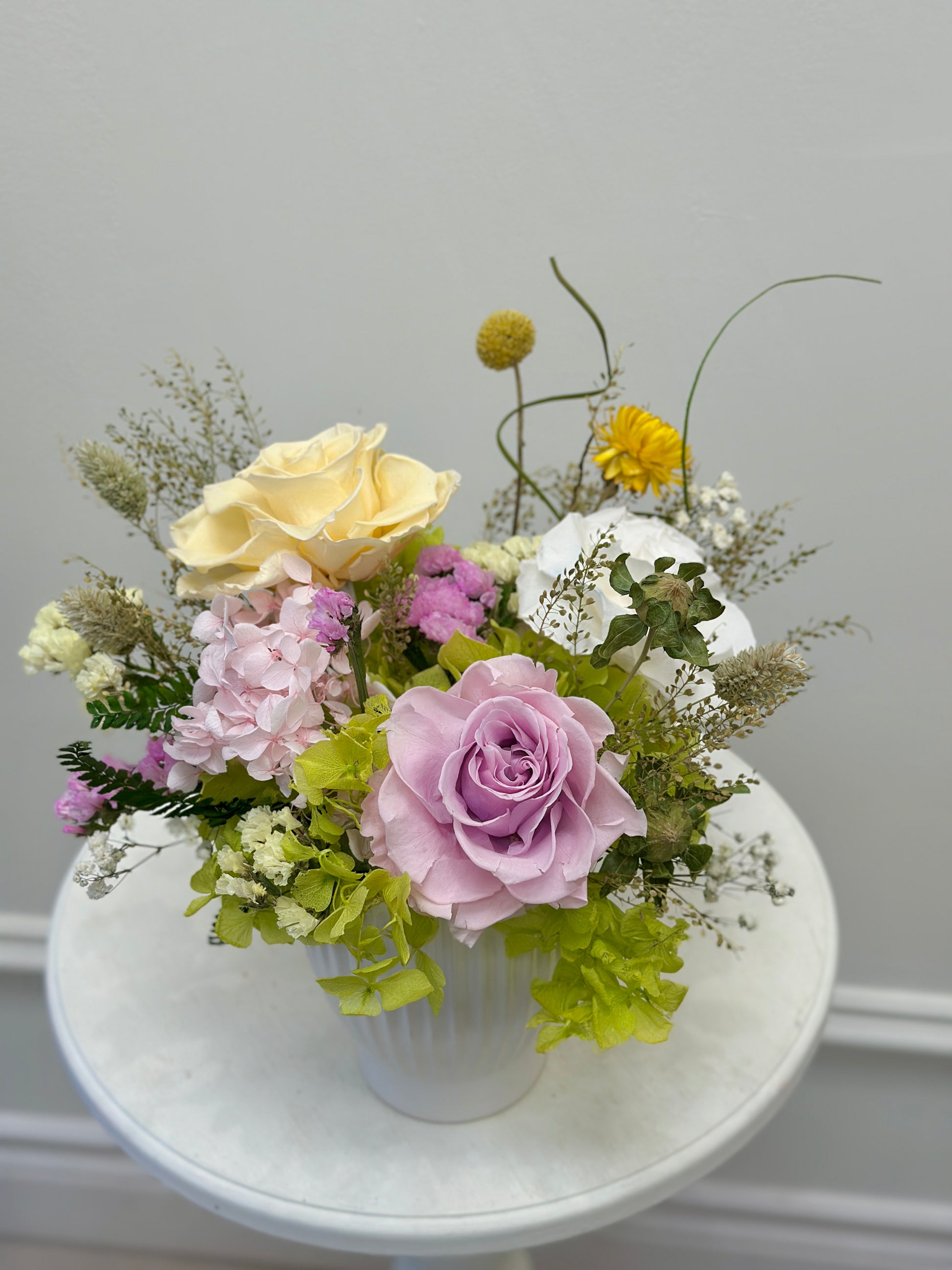 A graceful preserved flower arrangement featuring a premium lavender preserved rose as the focal point, paired with preserved hydrangea, ivory roses, and delicate textured botanicals. Soft pastel tones and airy meadow-inspired elements create a romantic yet modern composition that stays beautiful for months or even years with no watering needed.