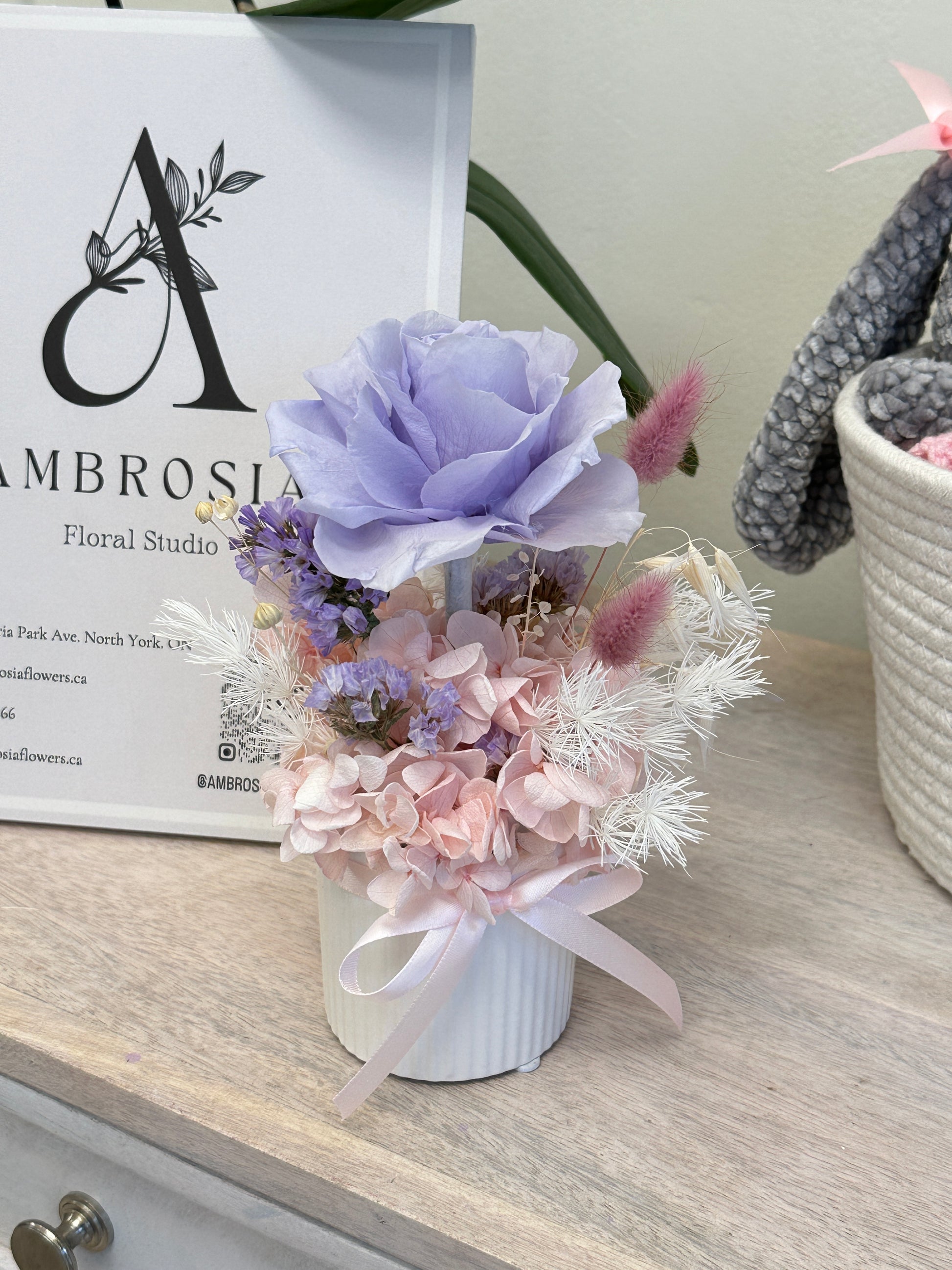 Delicate and charming, the Pastel Whisper Mini Preserved Pot is a petite everlasting arrangement designed to bring a soft touch of beauty to any space. Featuring a preserved lavender rose surrounded by pastel preserved hydrangea and delicate dried textures, this mini floral piece creates a dreamy and elegant look.