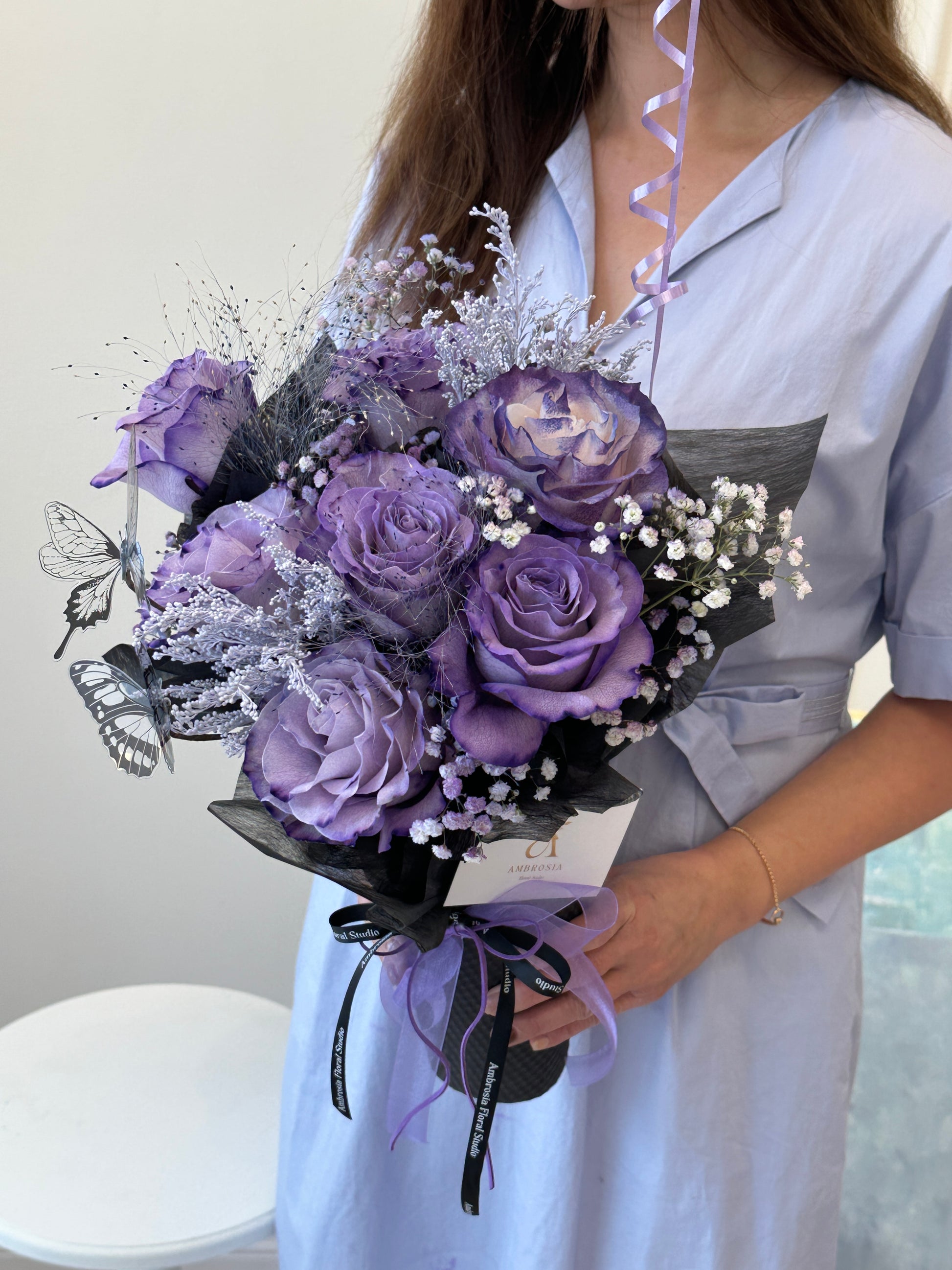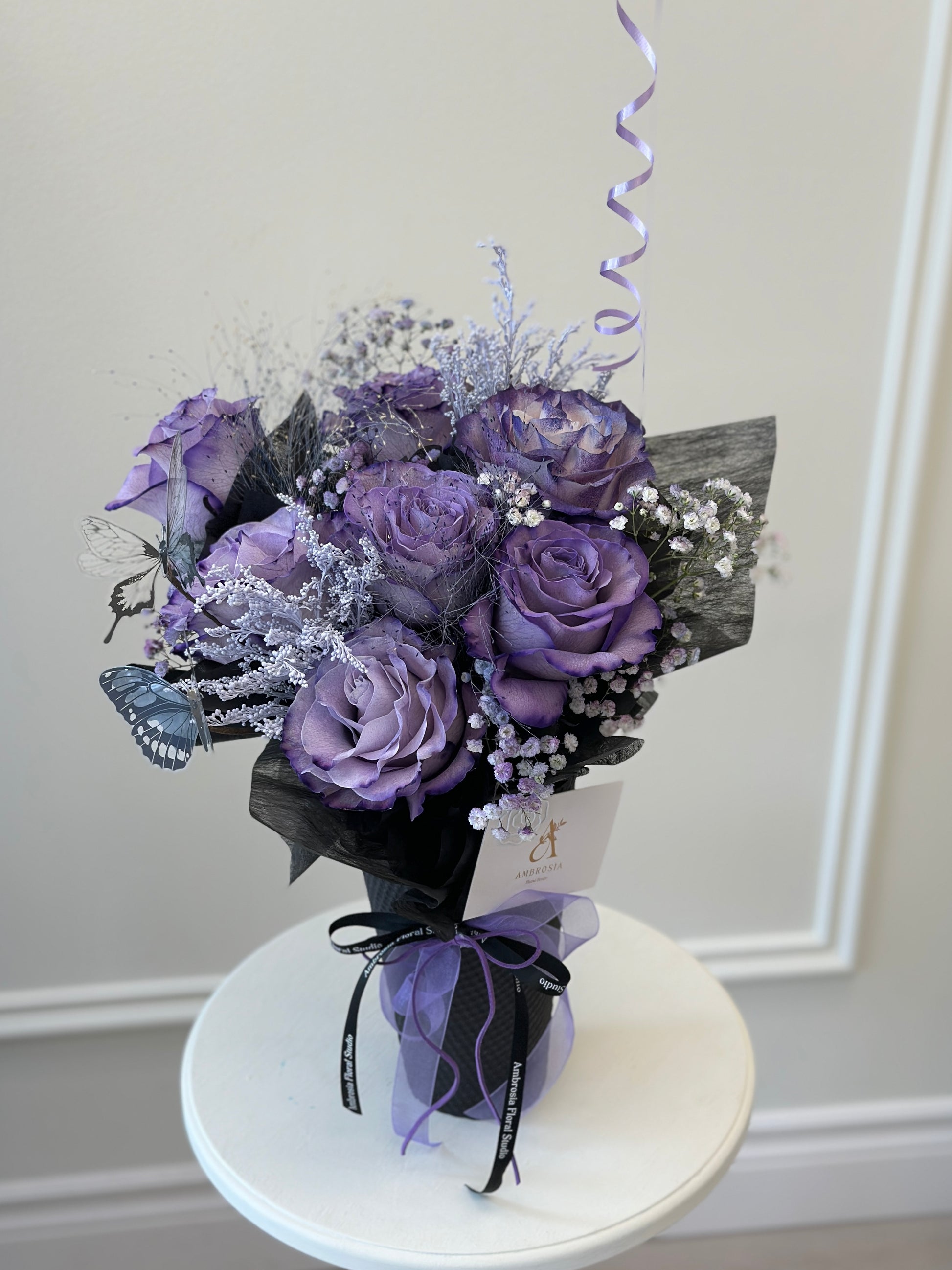 A moody, romantic flutter of tinted fresh roses and dark wing, wrapped in shadow.