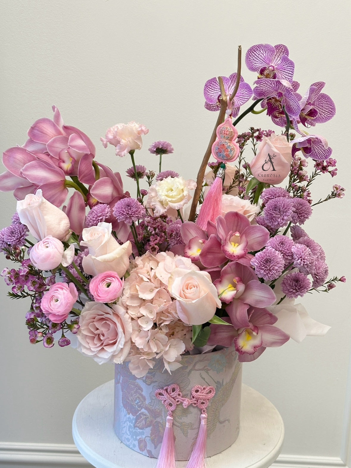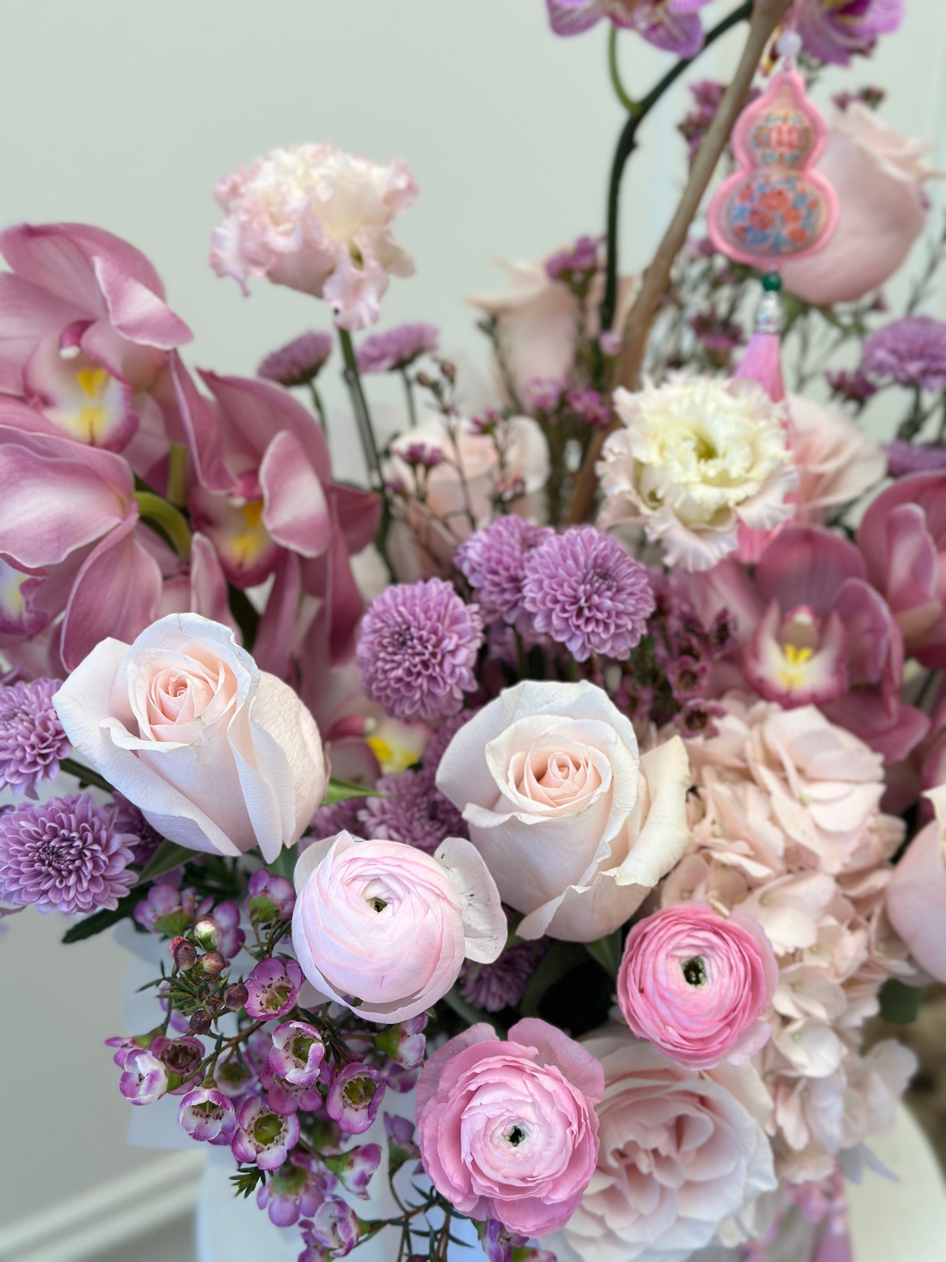 An elegant Lunar New Year flower box designed in soft pink and orchid tones, blending traditional festive meaning with a refined modern style.