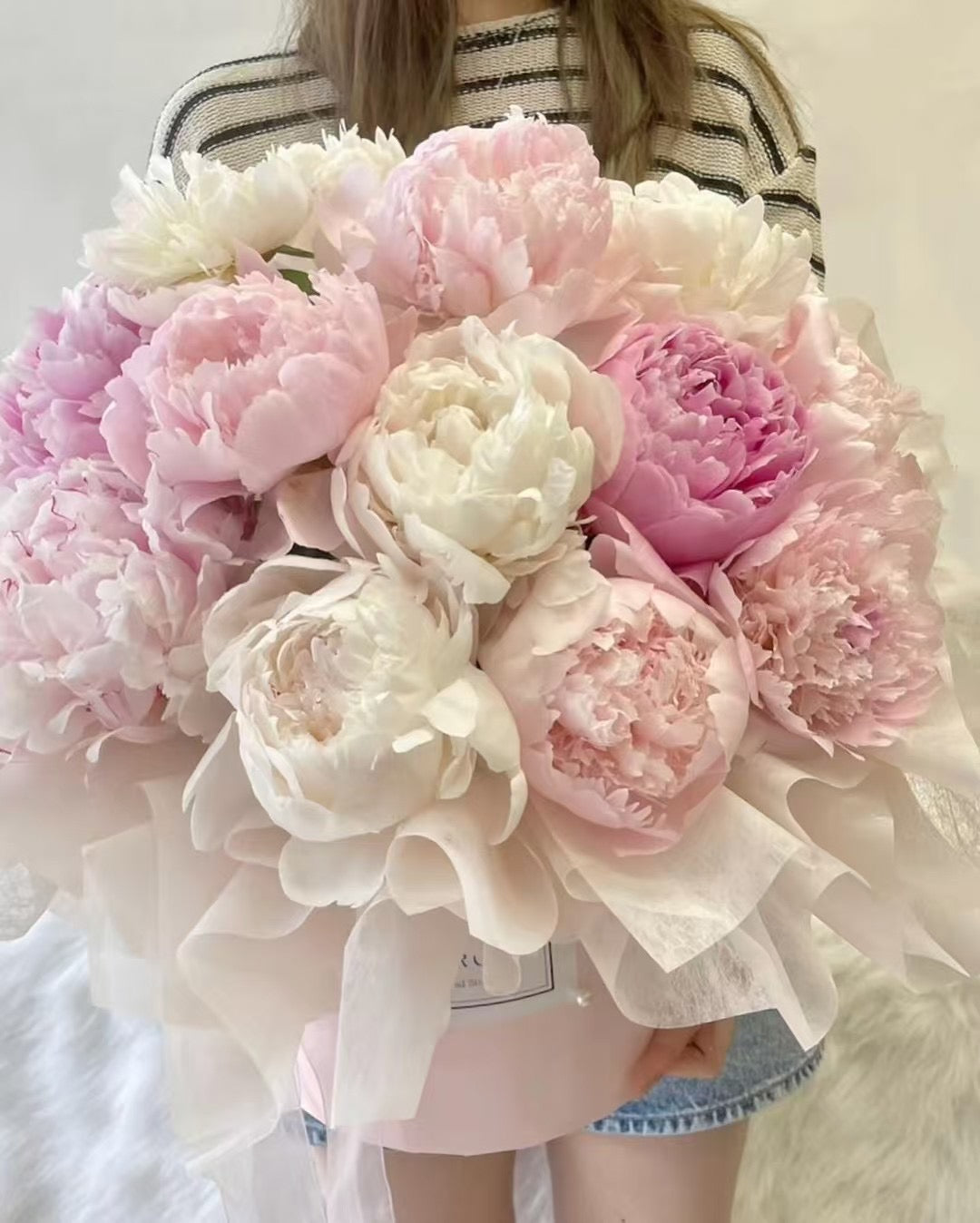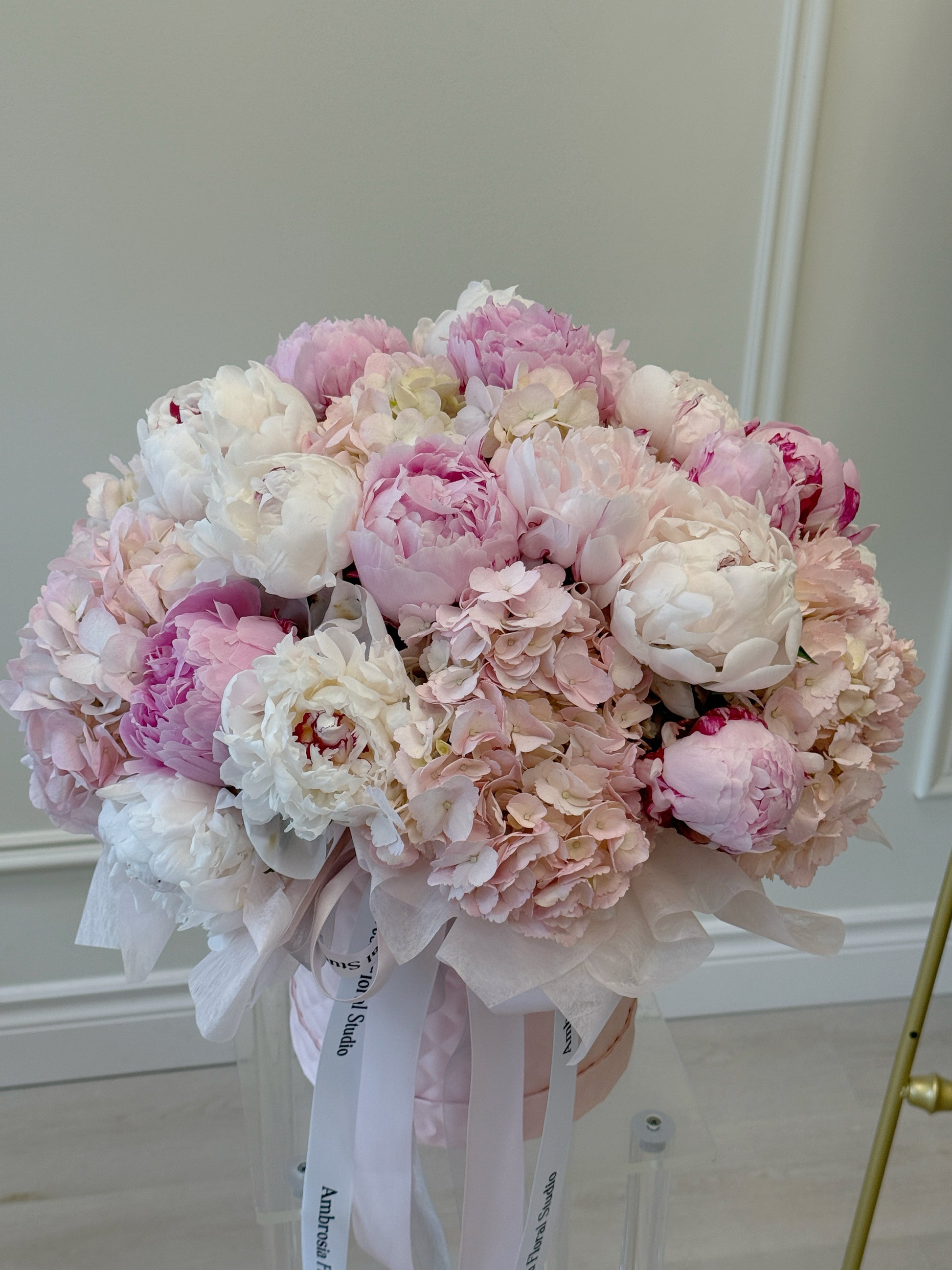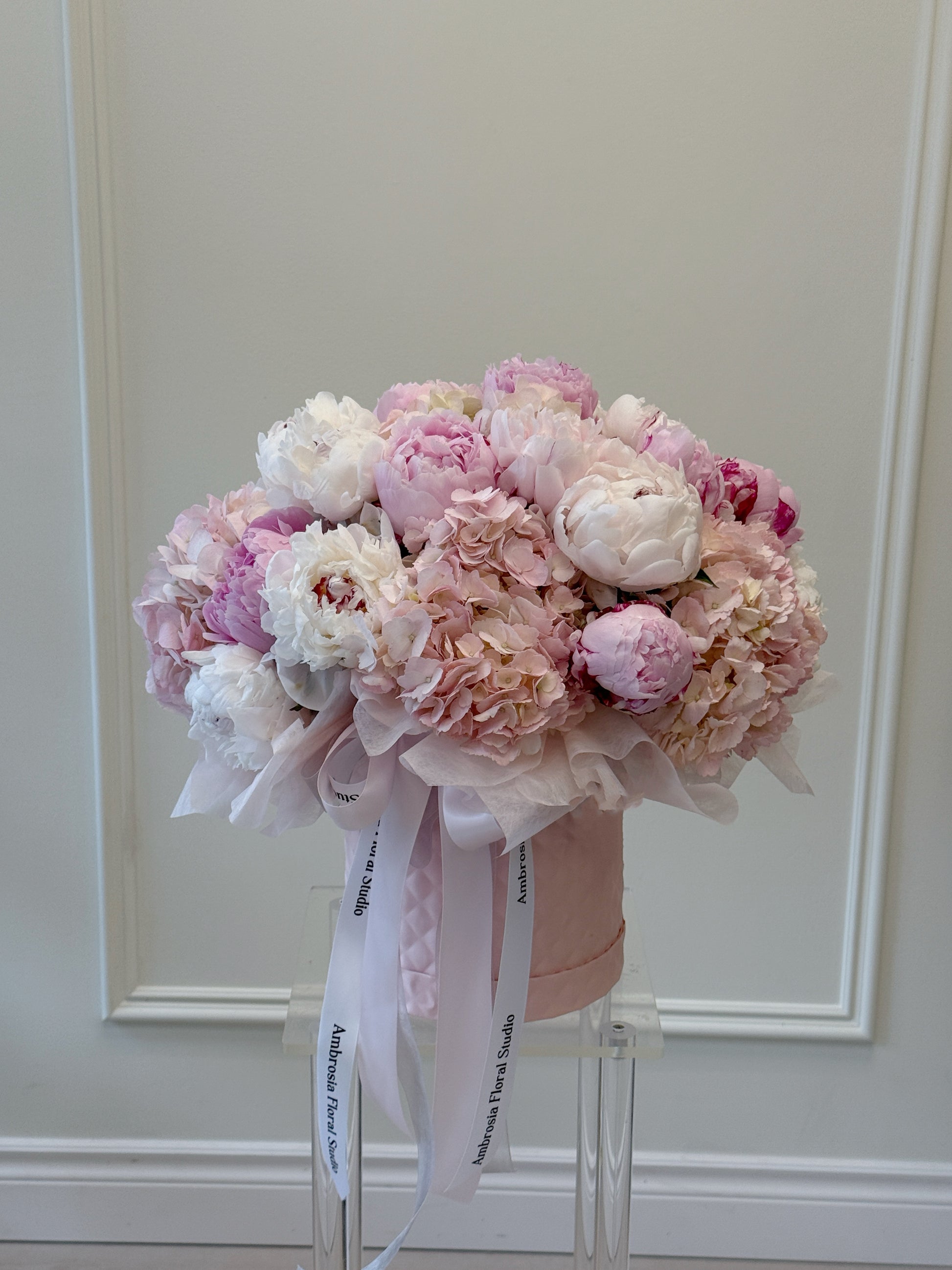15-25 premium peony blooms arranged elegantly in a hat box.