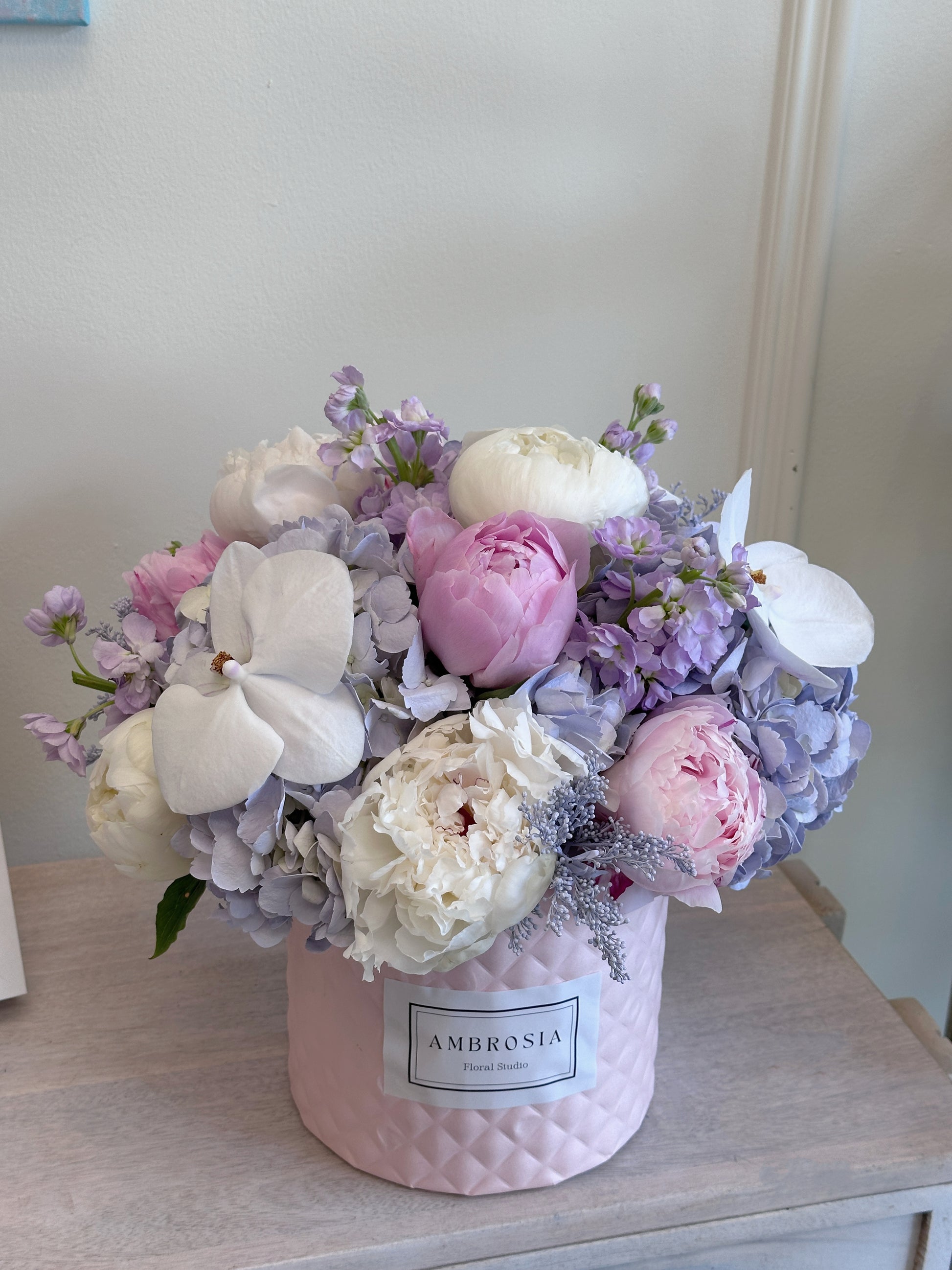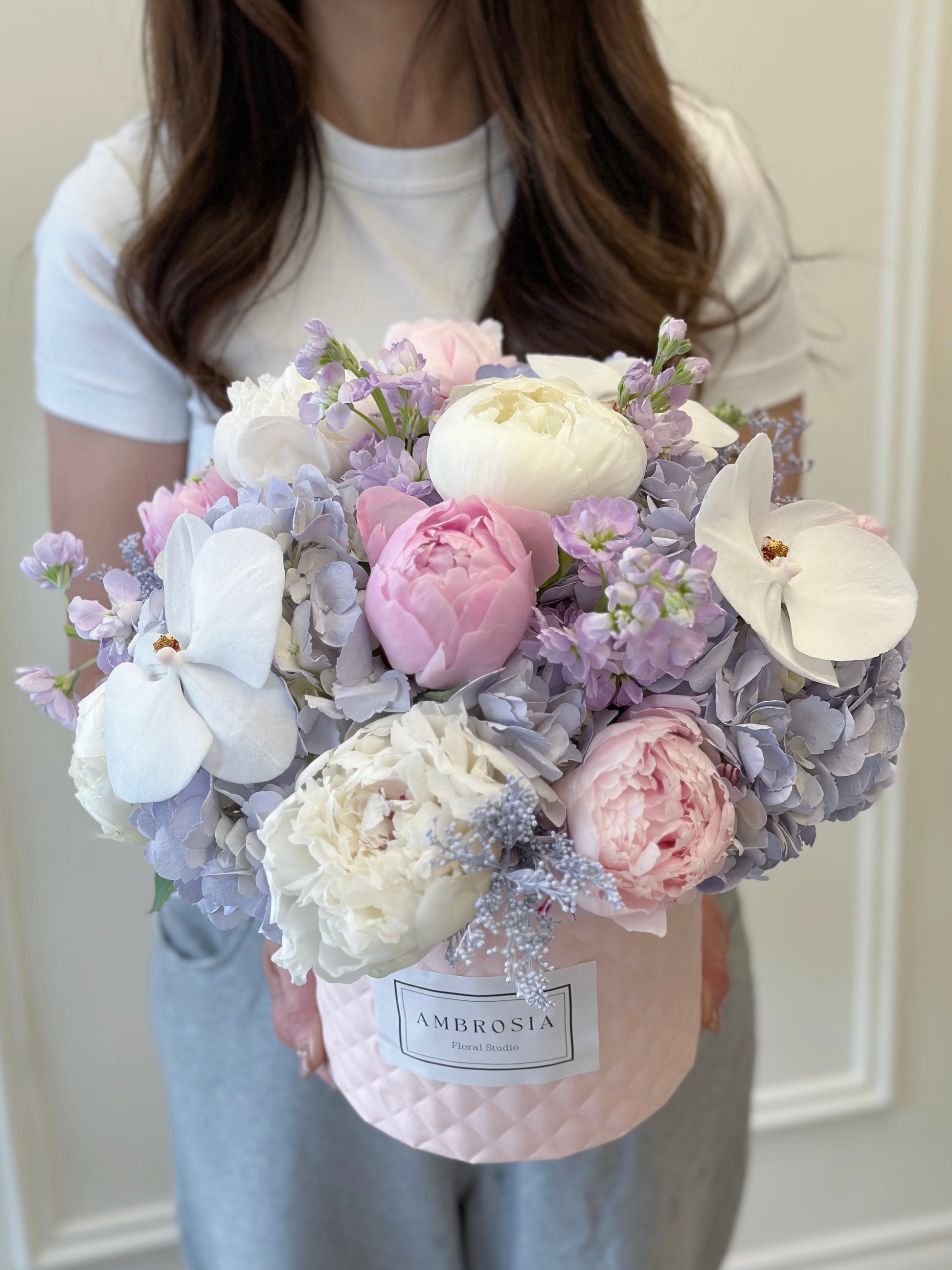 Premium peonies mixed with hydrangeas and orchids in hat box.