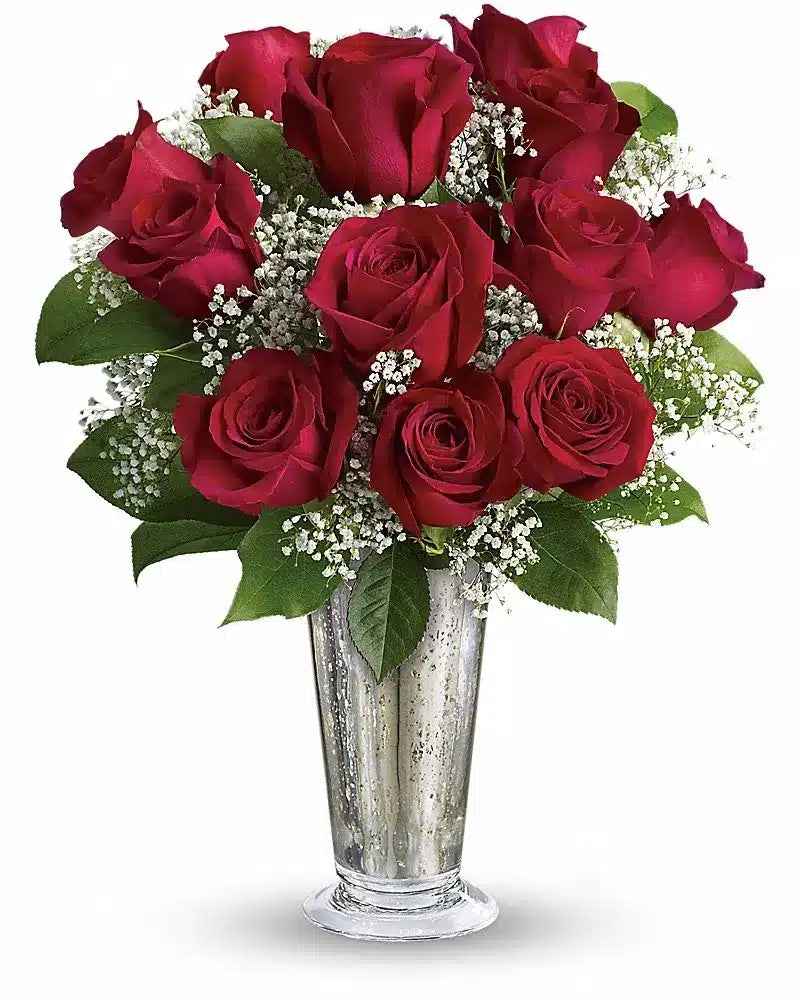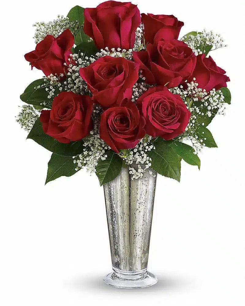 Twelve ravishing red roses mixed with gypsophila and greens are arranged in a Mercury Glass Antique vase. Send this kiss of bliss!