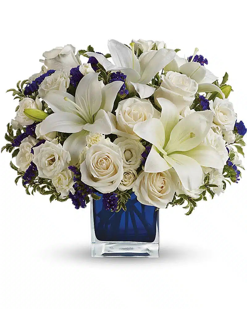 Send someone a bit of heaven with this beautiful bouquet. Luxurious crème roses and pure white lilies paint a peaceful picture inside a sapphire blue cube.