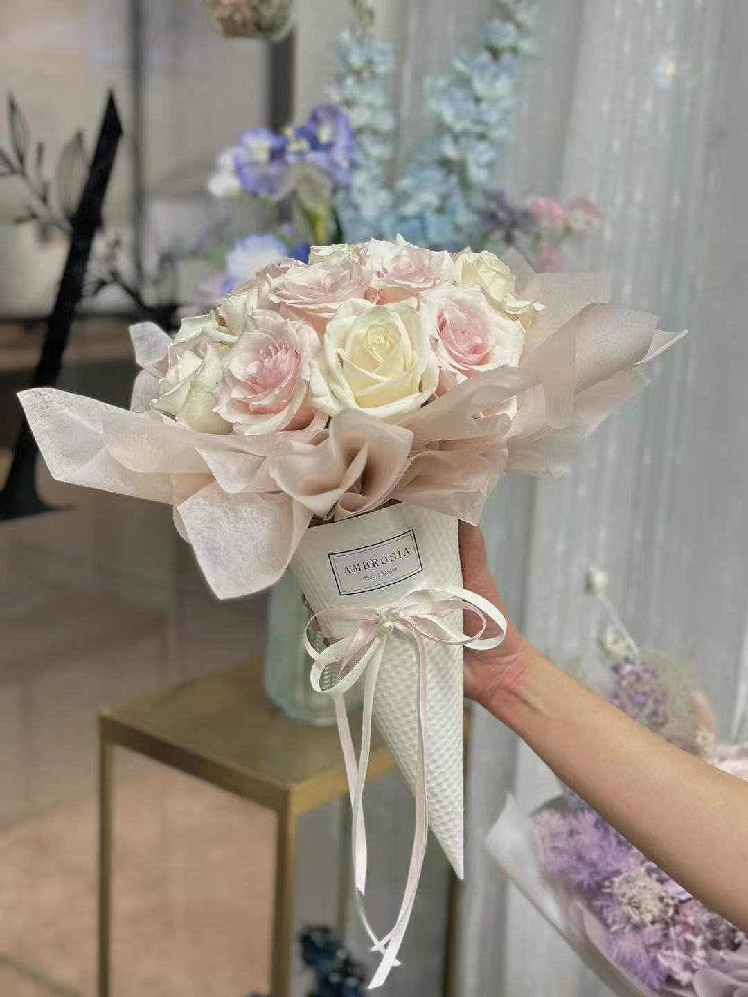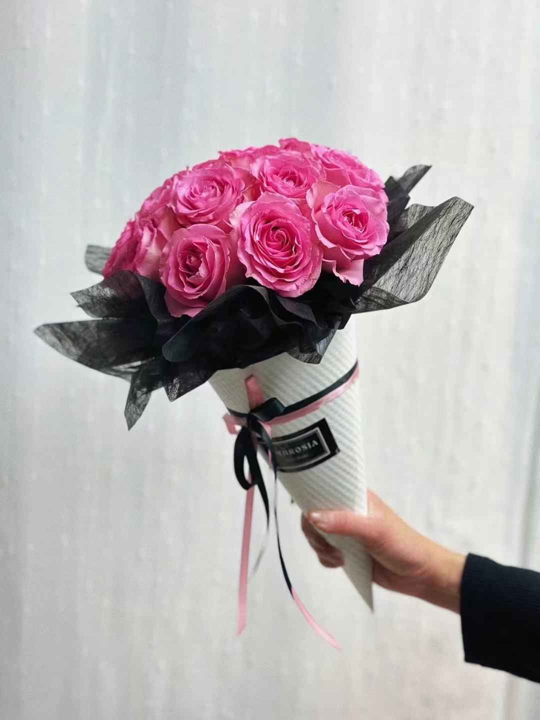 A twist on tradition! Our Sweetest Love Cone features 11-12 stems of pink roses hand-wrapped in a chic, cone-shaped design. Contact us for customized colors.